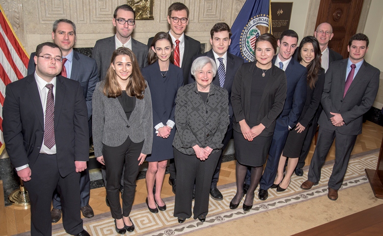 Left to Right: Michael Liotti, Aaron Jackson (Team Co-Advisor), Amanda Pine, Dan Reeves, Kathryn Mastromarino, Matt Zeglen, Janet Yellen (Chair, Federal Reserve), Michael Acampora, Aizhan Uzakova, Brian Levine, Alice Lin, Dave Gulley (Team Co-Advisor), Sal Visali.
