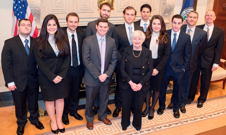 Left to Right: Michael Liotti, Mirtha Dominguez, Matt Paniati, Sal Visali, Dan Reeves, Alexis de Bruin, Janet Yellen (Chair, Federal Reserve), Santiago Rada, Aizhan Uzakova, Brian Levine, Aaron L. Jackson (Team Co-Advisor), Dave Gulley (Team Co-Advisor).